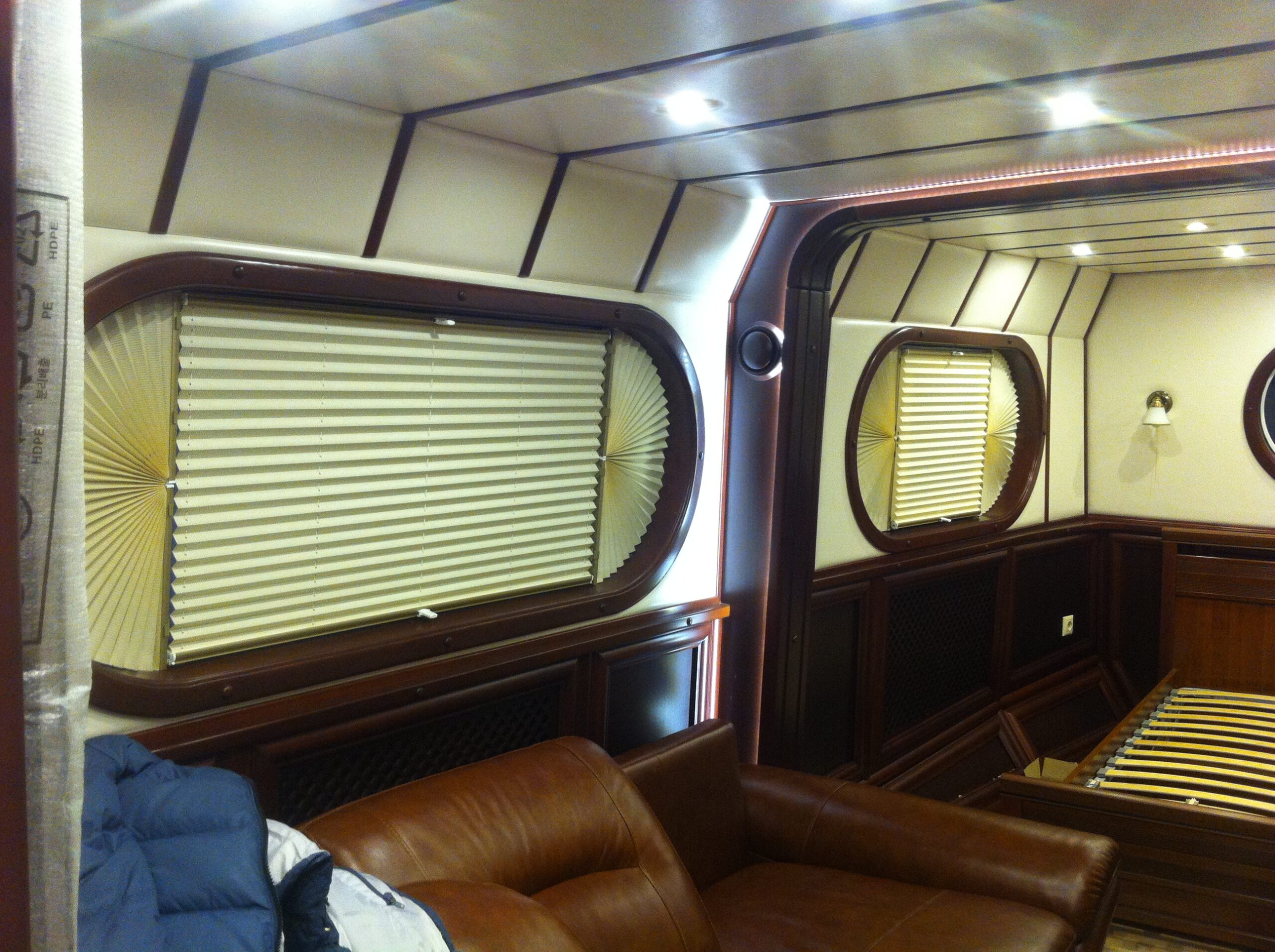 Изделия рассчитаны на монтаж в сочетании с потолочными окнами, а также крупными конструкциями, нередко устанавливаемыми в условиях зимнего сада. В отличие от продукции для наклонных окон, они могут иметь более сложную форму. Штора крепится на верхнюю и нижнюю часть оконной конструкции.